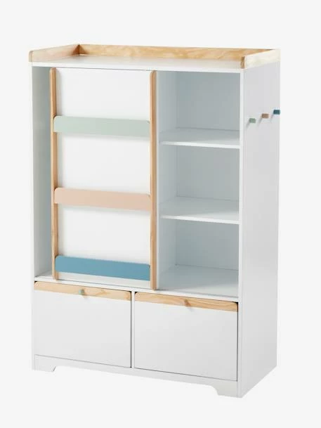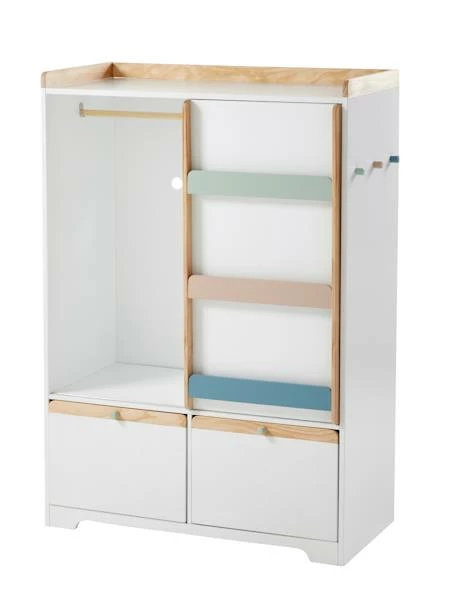 Une grande armoire aux belles astuces pour aider les petits Ă se dĂ©brouiller tous seuls ! Conçue Ă hauteur d’enfant, ils n’auront aucun mal Ă se crĂ©er eux-mĂŞmes leurs tenues chaque jour. Elle dispose d’un cĂ´tĂ© penderie et d’un cĂ´tĂ© avec Ă©tagères pour ranger les habits. Un pan coulissant composĂ© d’Ă©tagères de couleurs permet d’y disposer des livres et de fermer une partie de l’armoire. Sur la base, deux grands tiroirs coulissants peuvent recevoir les chaussures, les jouets, le linge de lit etc. Les diffĂ©rentes couleurs prĂ©sentes sur cette armoire ont Ă©tĂ© imaginĂ©es pour que l’enfant puisse se repĂ©rer et trier plus facilement.Â