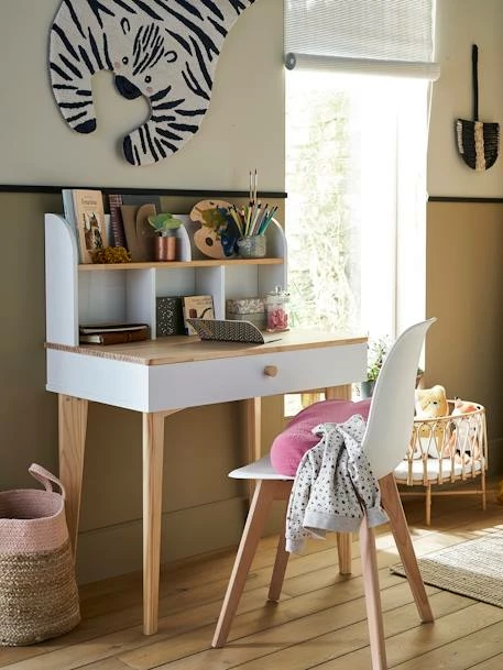 Compact et design, le bureau Scandi séduit par son look tendance avec son alliance de blanc et de bois et son piètement croisé et offre à l’enfant un bel espace de travail et de rangements pour ses devoirs et ses activités manuelles.