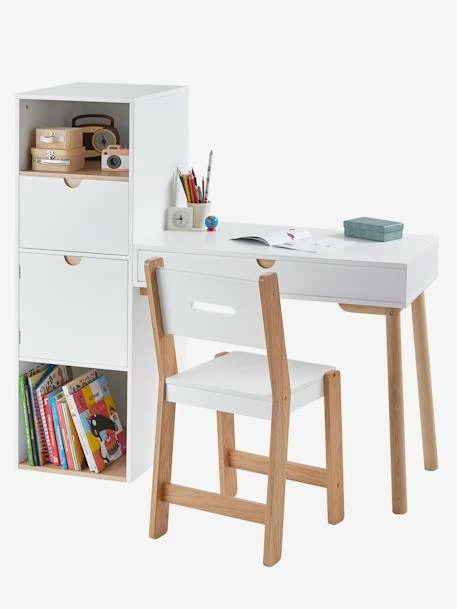 Un bureau joli et pratique avec ses rangements ouverts et ses rangements fermĂ©s ! Deux niches, un placard et deux tiroirs, parce qu’il n’y a jamais assez de place pour ranger toutes leurs affaires d’Ă©coliers.