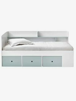 Solution gain de place, un lit compact avec des tiroirs devant, des Ă©tagères dessus, des niches sur les cĂ´tĂ©s…. On n’a jamais rien trouvĂ© de mieux pour avoir une chambre bien rangĂ©e tout en conservant l’espace ! LivrĂ© avec sommier.