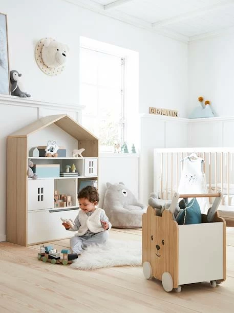 La tendance scandinave continue de nous faire rĂŞver avec des dĂ©tails toujours plus travaillĂ©s. Difficile de ne pas craquer devant cet adorable meuble de rangement en forme de maison ! Une alliance de bois blond, de niches, d’un tiroir et de placards aux portes ajourĂ©es qui fait Ă la fois office de rangement pour jouets et de bibliothèque !