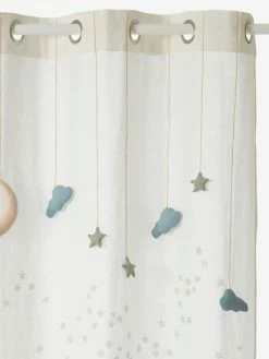 Suspendue Ă de petits fils, la lune, accompagnĂ©e de nuages et d’Ă©toiles roses et gris dĂ©corent avec poĂ©sie ce joli rideau tamisant !